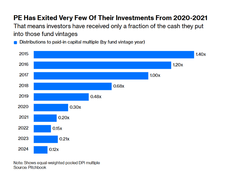 Private equity firms are sitting on a massive portfolio of software and tech assets acquired at 2020-2021 valuations that they cannot exit. Distributions to investors in 2024 were more than ten times lower than 2015 levels. The average holding period has stretched to 6.6 years. The 2020 and 2021 vintage funds, which deployed heavily into software during peak valuations, are showing DPI multiples of 0.30x and 0.20x respectively.
