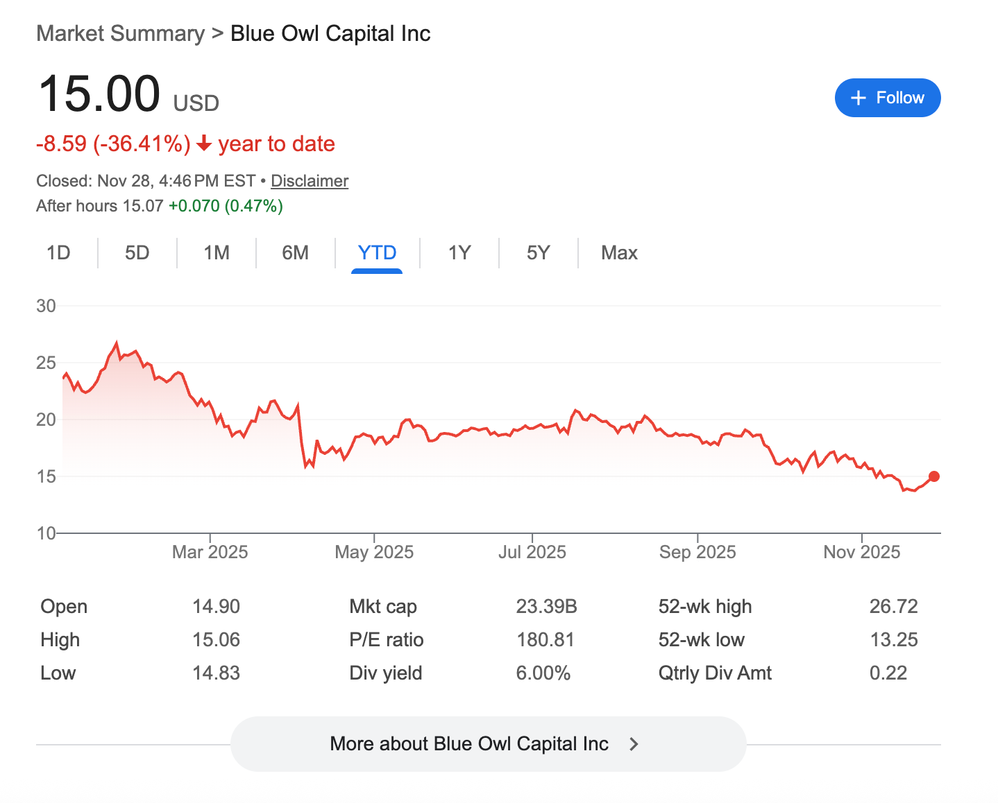 Lipschultz calling investor fears “ungrounded” and comparing market anxiety to the Mandela Effect is a bold defense. Average realized losses of 0.13% and record capital commitments support his case. But the transparency problem is real: with no independent ratings commentary and valuations diverging widely on stressed credits, investors fill the information vacuum with worst-case scenarios. Blue Owl sits in the middle of a Venn diagram of concerns, and that’s why it’s getting whacked regardless of underlying fundamentals.